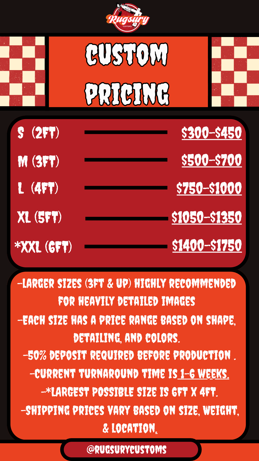 This form is designed for users who are interested in ordering their own personal custom rug. *Filling out this form does not guarantee addition to the wait list, it simply provides a quote for your specific inquiry. Upon completion of this form, a quote will be sent to you along with forms of payment, and the requirement of a 50% deposit that is included into your total price. Once the deposit has been submitted your order will be confirmed and you will be added to the wait list.*